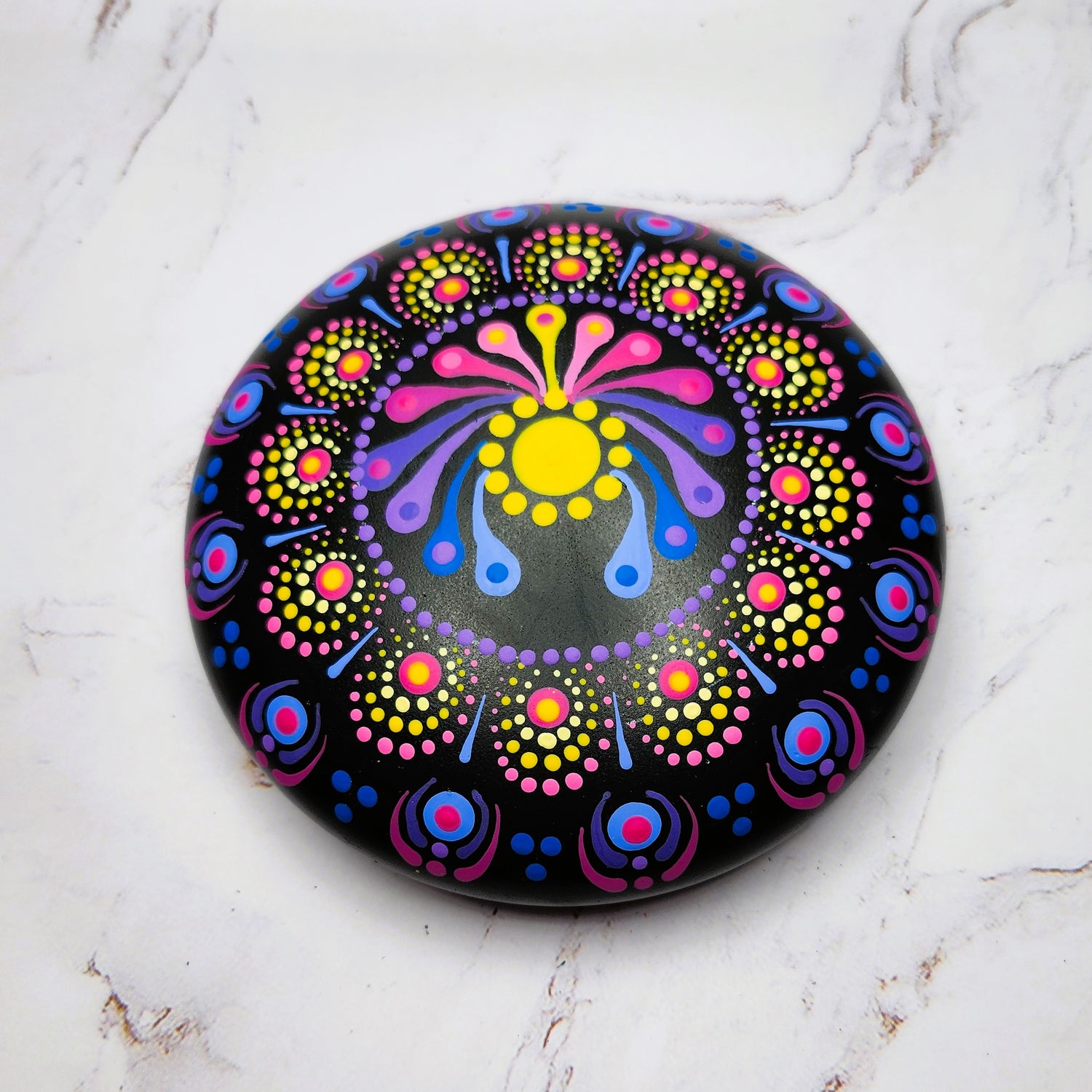 I find mandala dot painting meditative, relaxing, and satisfying. My desire to share my art comes from a love of the handmade items made by others in my own collection. I hope you find something here that speaks to you. Find out more about me by clicking here.