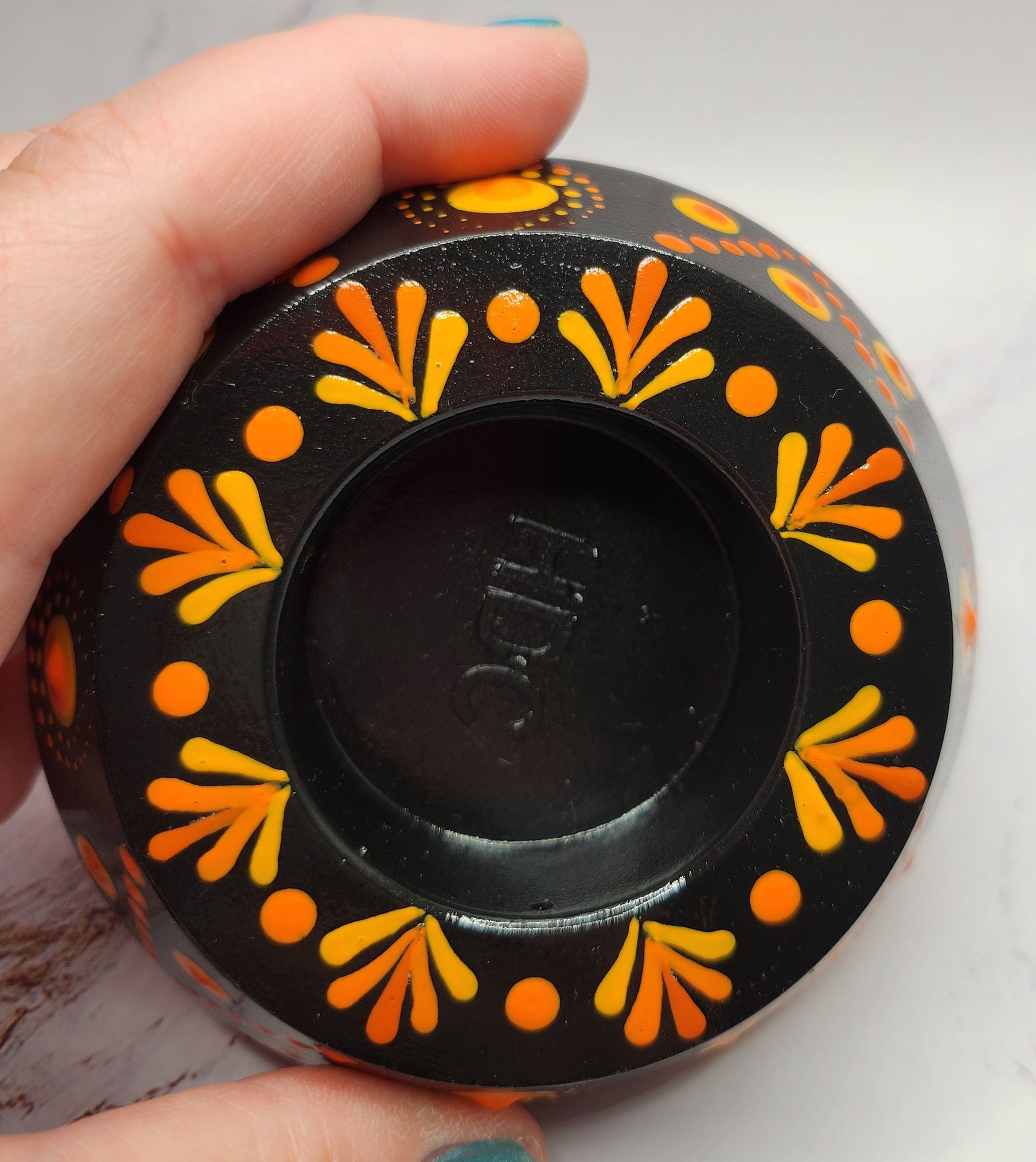 Inspired by glowing sunsets, this hand-painted tea light holder features rich black tones layered with sunset orange and golden yellow mandala dots. The repeating patterns and petal-like accents create a rhythmic, calming design that comes alive when candlelight flickers through the center.