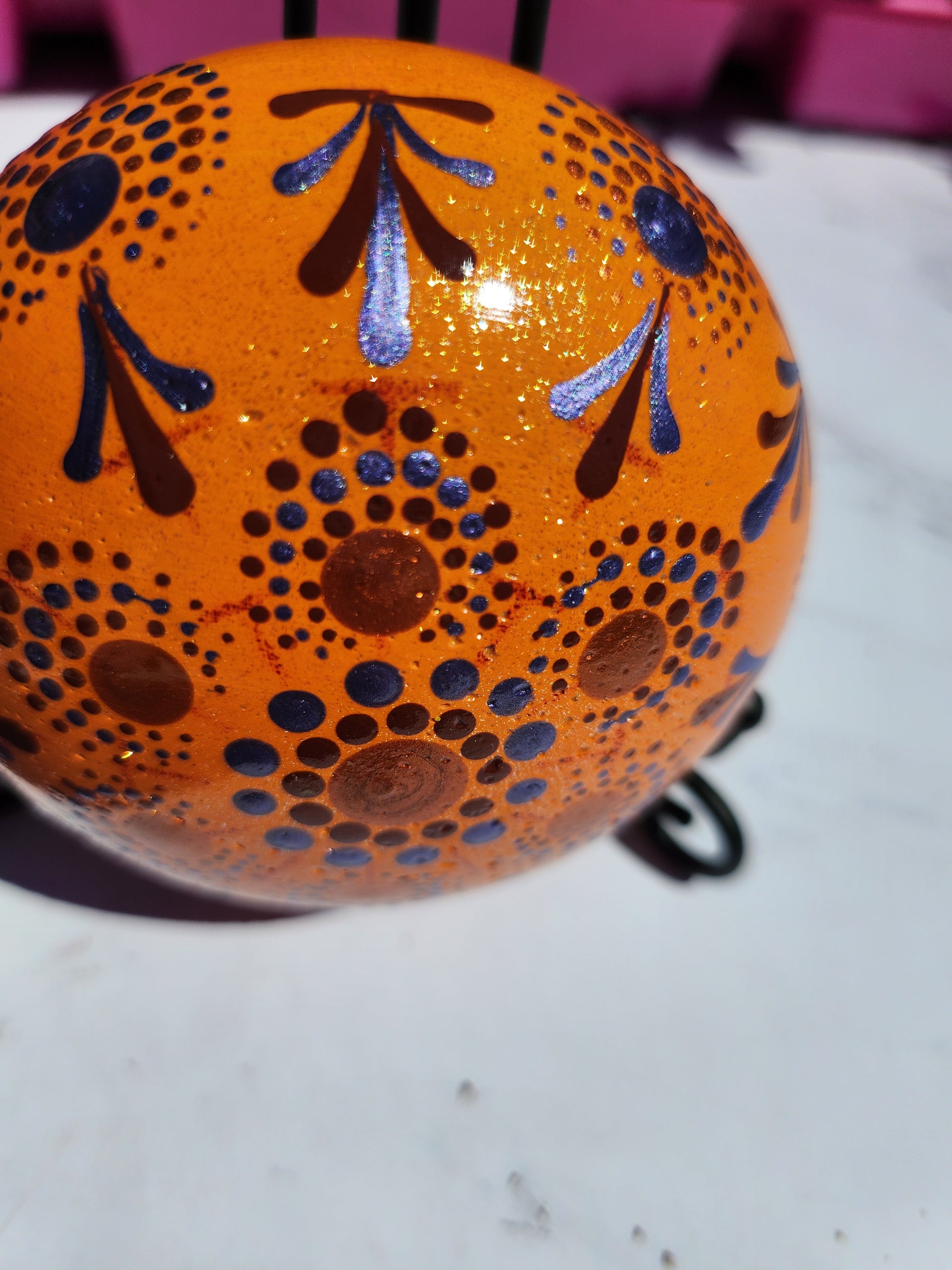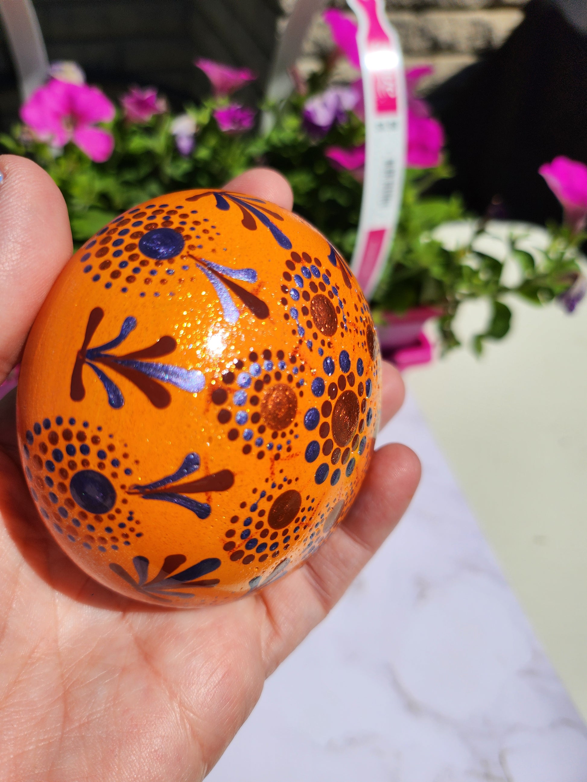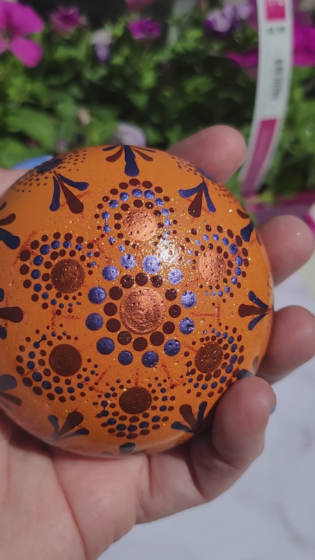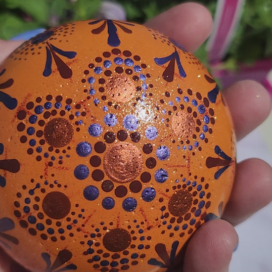 - Acrylic paint is hand painted in a beautiful mandala dotting pattern: shimmery purple, and rich copper