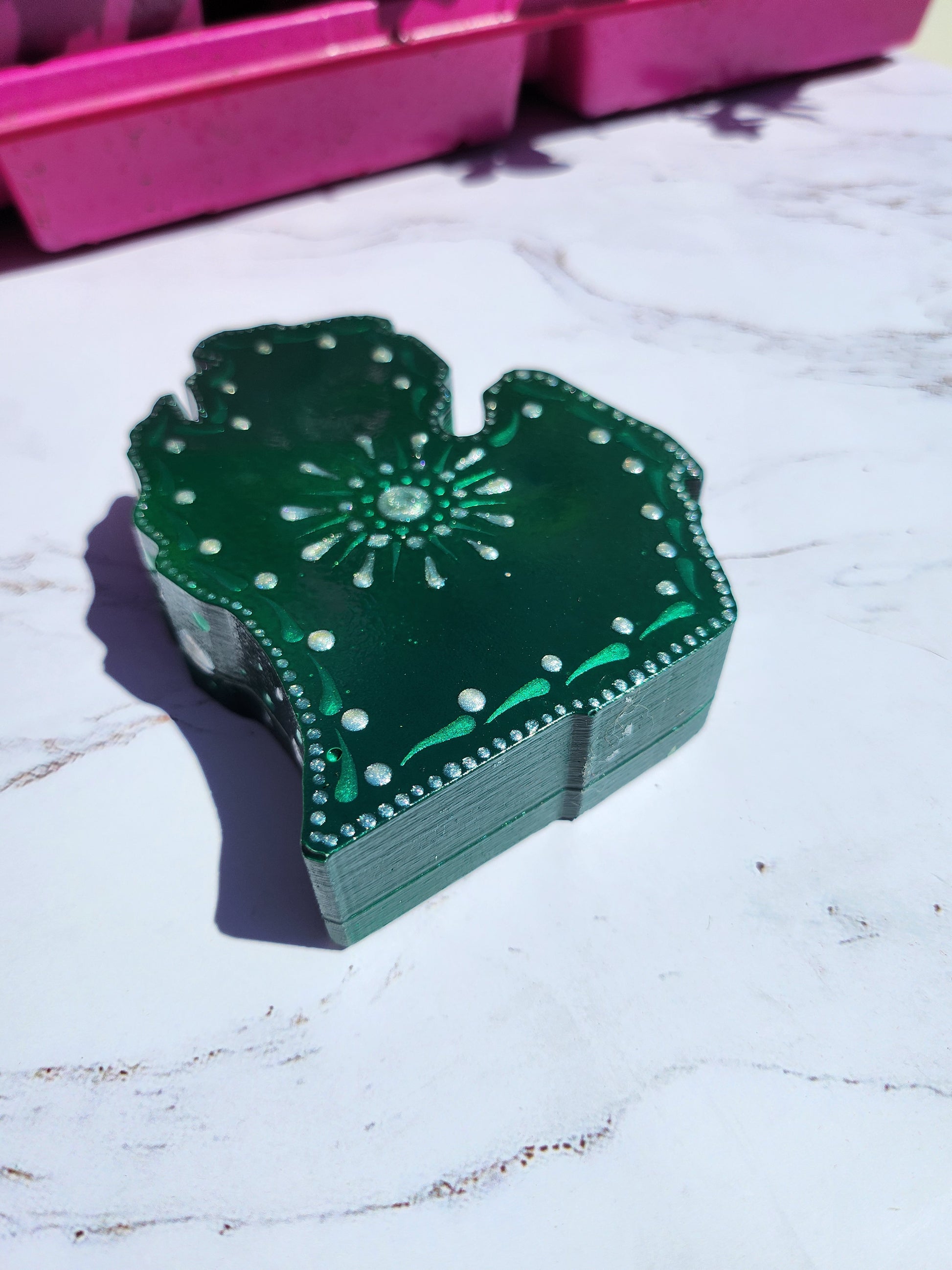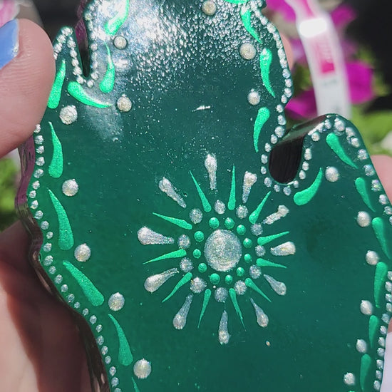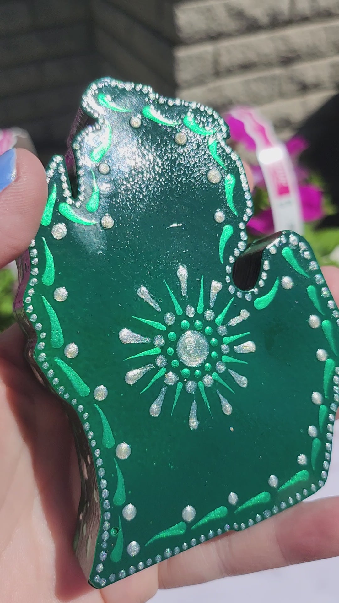 - Metallic white and silver acrylic paint is hand painted in a beautiful mandala dotting pattern